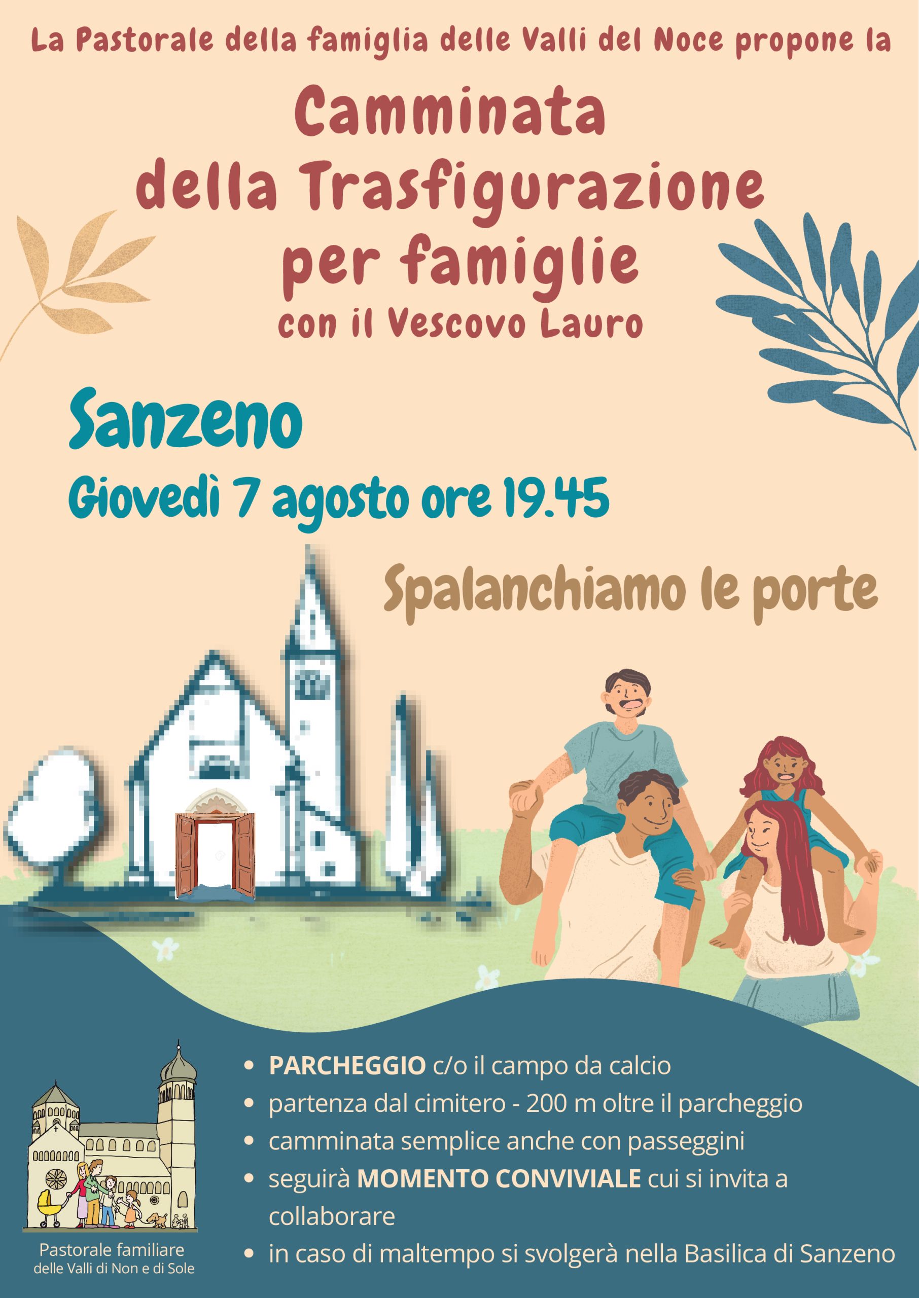 Come ogni anno, ormai da diverso tempo, agli inizi di agosto la pastorale delle famiglie della zona valli del Noce propone la camminata della Trasfigurazione. L’appuntamento, è una bella occasione di incontro tra famiglie, riflessione, convivialità. Quest’anno la data fissata è Giovedì 7 Agosto mentre  la località scelta, in questo anno giubilare della Speranza, è il paese di Sanzeno, con partenza alle 19.45 dal cimitero. Ci sarà, come ogni anno, il nostro vescovo Lauro, che ogni anno vuole rinnovare la sua partecipazione a questo evento estivo che coinvolge tante famiglie della nostra zona.
